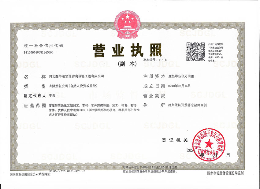 河北鑫豐達(dá)管道防腐保溫工程有限公司坐落于滄州市開發(fā)區(qū),通過(guò)ISO9000質(zhì)量管理體系認(rèn)證。本廠擁有工程師4名、技術(shù)人員30名,員工60人,注冊(cè)資金5500萬(wàn)元。專門從事3pe/2pe防腐鋼管、保溫防腐鋼管、防腐螺旋鋼管、水泥砂漿防腐鋼管、等配套工程施工,以及防腐材料研發(fā)制造的大型專業(yè)化企業(yè)。是河北省防腐保溫行業(yè)協(xié)會(huì)理事單位。年生產(chǎn)能力500萬(wàn)平方米。